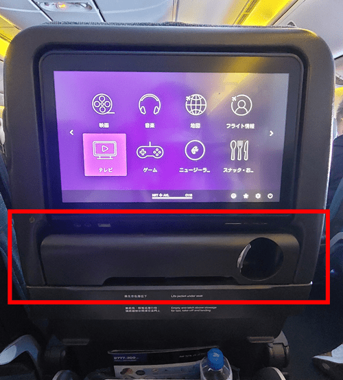 テーブルのほかに、スクリーン下の赤枠のような小物置もありました。これ、本当に便利です(ZIP AIRにもありました)。